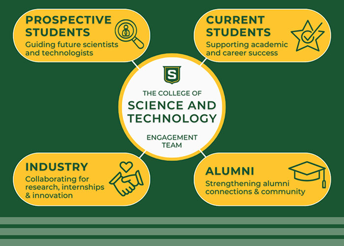 Greetings from the College of Science and Technology Engagement Team! Our mission is to facilitate an inclusive, relevant, and supportive community that connects prospective students, current students, alumni, and industry partners. We are focused on developing and maintaining meaningful opportunities that will enhance the overall experience for all partners and members of our college. Explore our focus areas to learn more about how we support and engage with our diverse stakeholders.